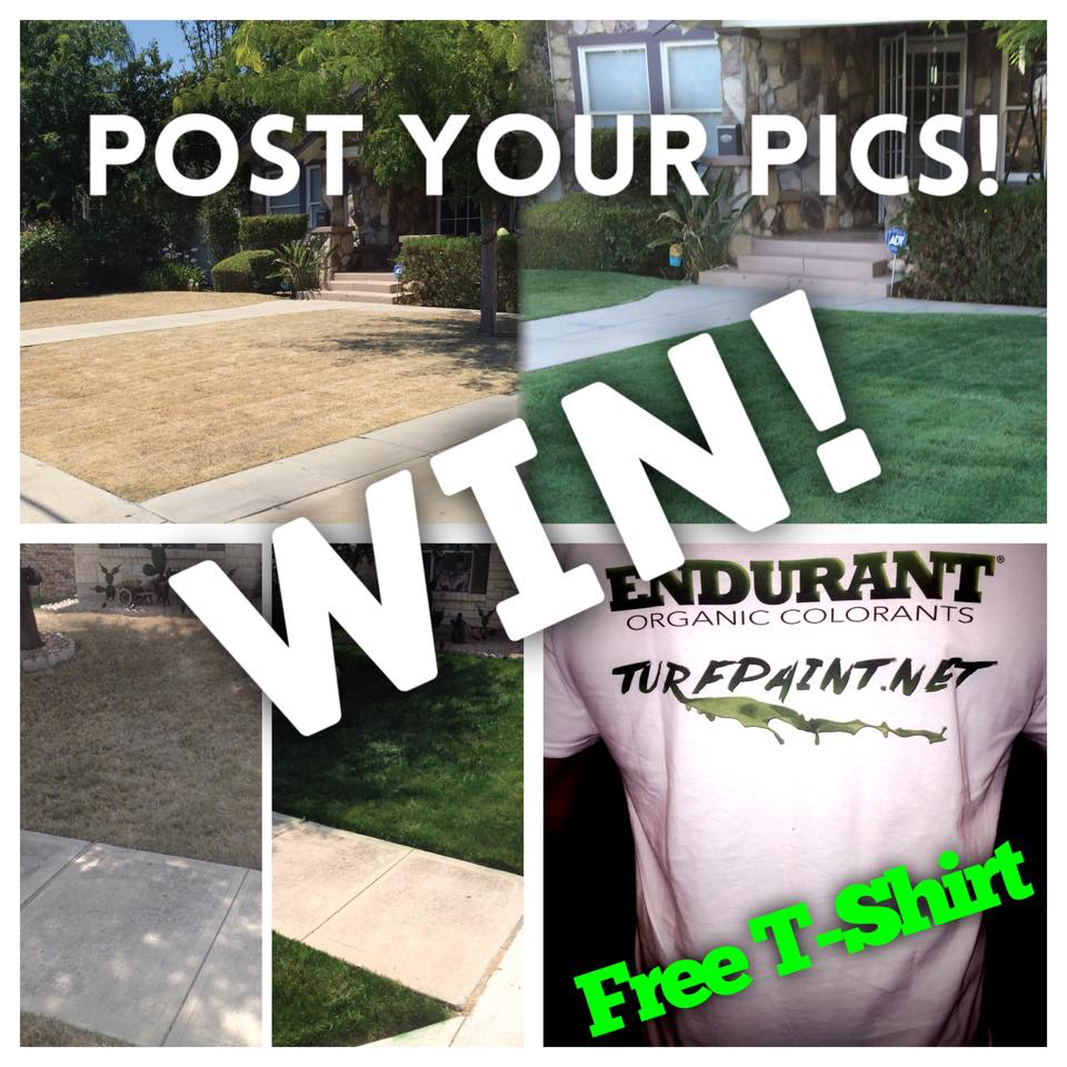 Take a before picture of your lawn or a problematic area of your lawn that is to be painted. Choose the same time of day, angle and similar lighting when you take the after photo. Brag on social media about your greenest lawn on the block and qualify to win a free t-shirt!